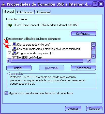 servicios tales como "Cliente para redes Microsoft" y " Compartir impresoras y